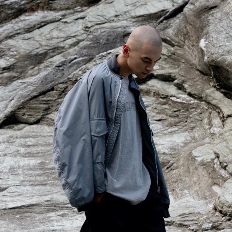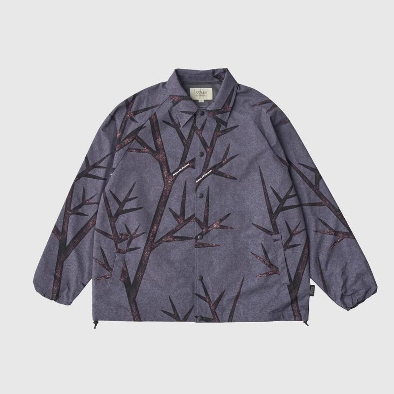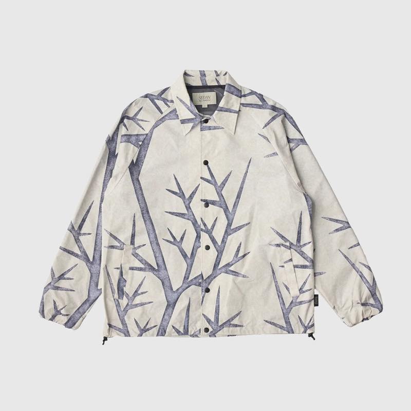 数年に一度くるでお馴染みのカモフラブームが来ている。(自分調べ)特に最近はスノーカモと呼ばれるホワイトベースのカモフラージュ柄が気になっていてリアルツリーっぽい柄で総柄を作ってもらった。総柄は一般的に同じ絵を何枚繋げていっても柄がずれないようにできている。その柄が大きければ大きいほど大変なのだが今回は人1人が収まるくらいのビッグサイズな送り柄を作る必要があり、柄を作ってくれている勇太くんには感謝している。そんな思い入れのあるカモ柄で作ったコーチジャケット。スノーカモ柄は本来ミリタリーやハンティング要素の強いアイテムが多いので、あえてリラックスして着れるコーチジャケットにしてみました。ラグランスリーブや衿のシルエットなど細かな部分にもこだわって作っています。