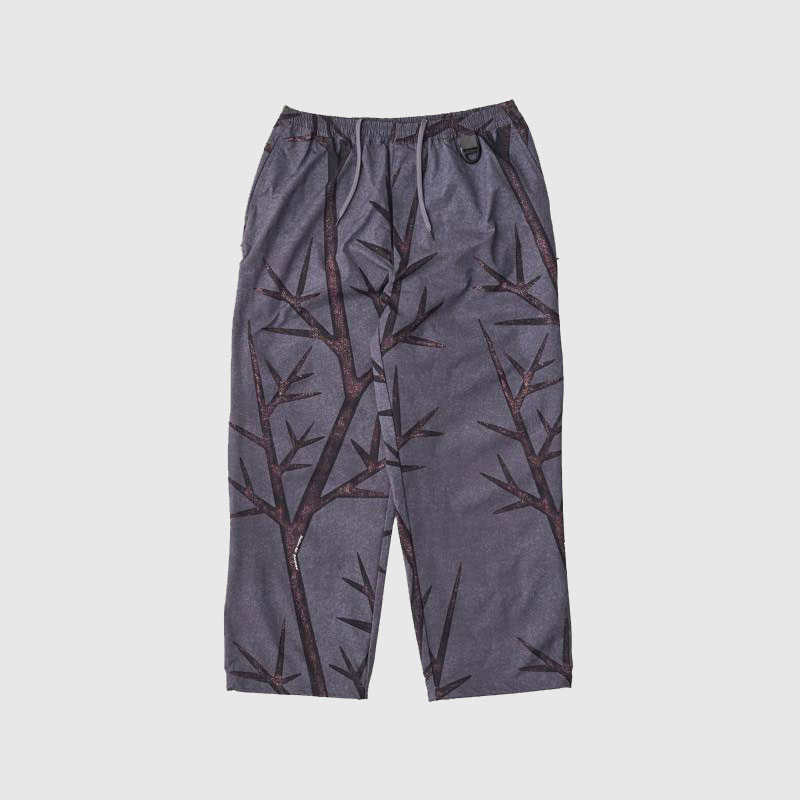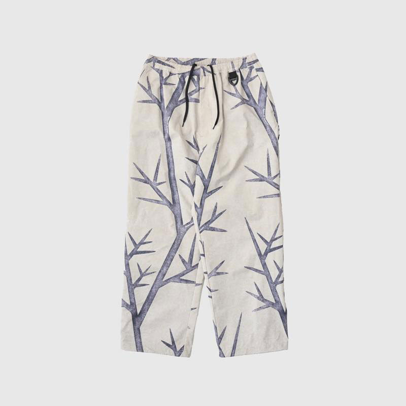 数年に一度くるでお馴染みのカモフラブームが来ている(自分調べ)。特に最近はスノーカモと呼ばれるホワイトベースのカモフラージュ柄が気になっていてリアルツリーっぽい柄で総柄を作ってもらった。総柄は一般的に同じ絵を何枚つなげていっても柄がずれないようにできている。その柄が大きければ大きいほど大変なのだが今回は人1人が収まるくらいのビッグサイズな送り柄を作る必要があり柄を作ってくれている勇太くんには感謝している。そんな思い入れのあるカモ柄で作ったトラックパンツ。スノーカモ柄は本来ミリタリーやハンティング要素の強いアイテムが多いので、あえてリラックスして着れるトラックパンツにしてみました。キーホルダーをぶら下げるD管や脇に付けたベンチレーションのメッシュなどディティールにもこだわった1本です。