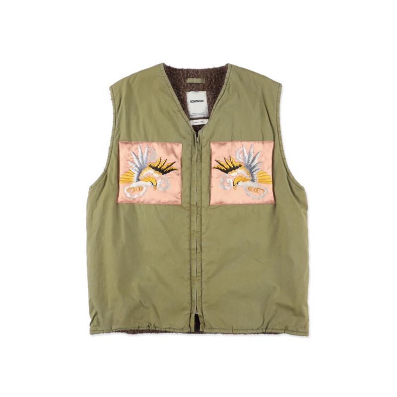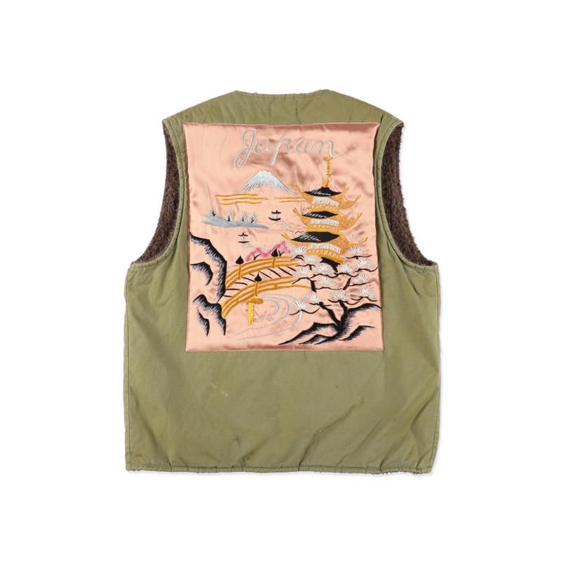 40年代にUSNで採用されたアルパカボアライニングのデッキベストをデザインの出発点に、BOW WOWは“そこで終わらせない”。当時、日本に出向いた兵士が土産のスカジャンから刺繍を切り出し、私物のベストへ縫い付けたそんな物語を設定し、レーヨン刺繍パーツの艶と糸の経年差、ベスト単体で着倒された汚れ・擦れまでリアルに再現。ミリタリーとスーベニアの記憶が交差する一着は、50年代が生んだ“着るアート”をいまに映す。