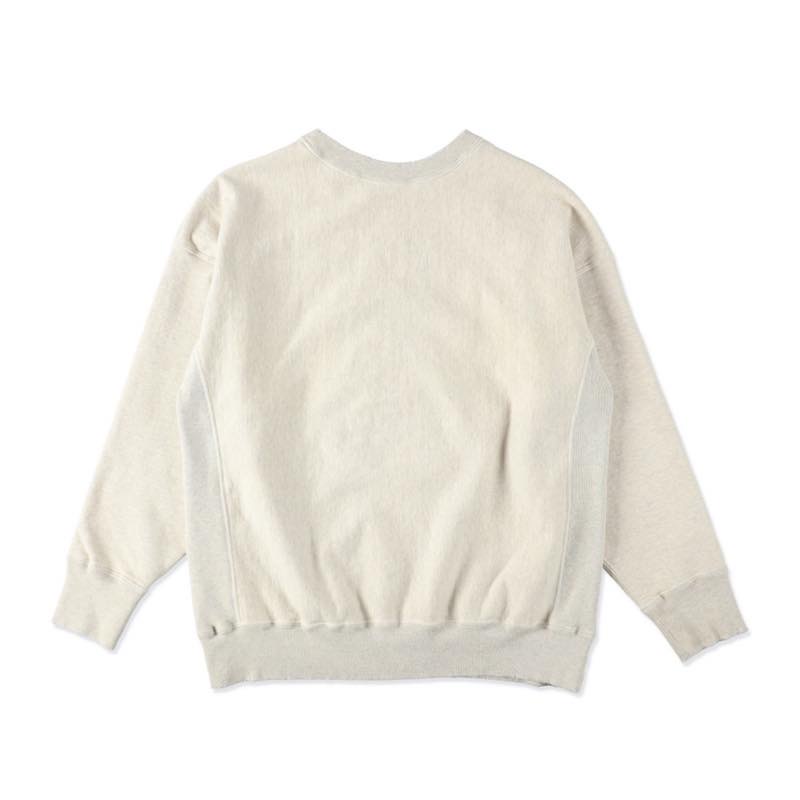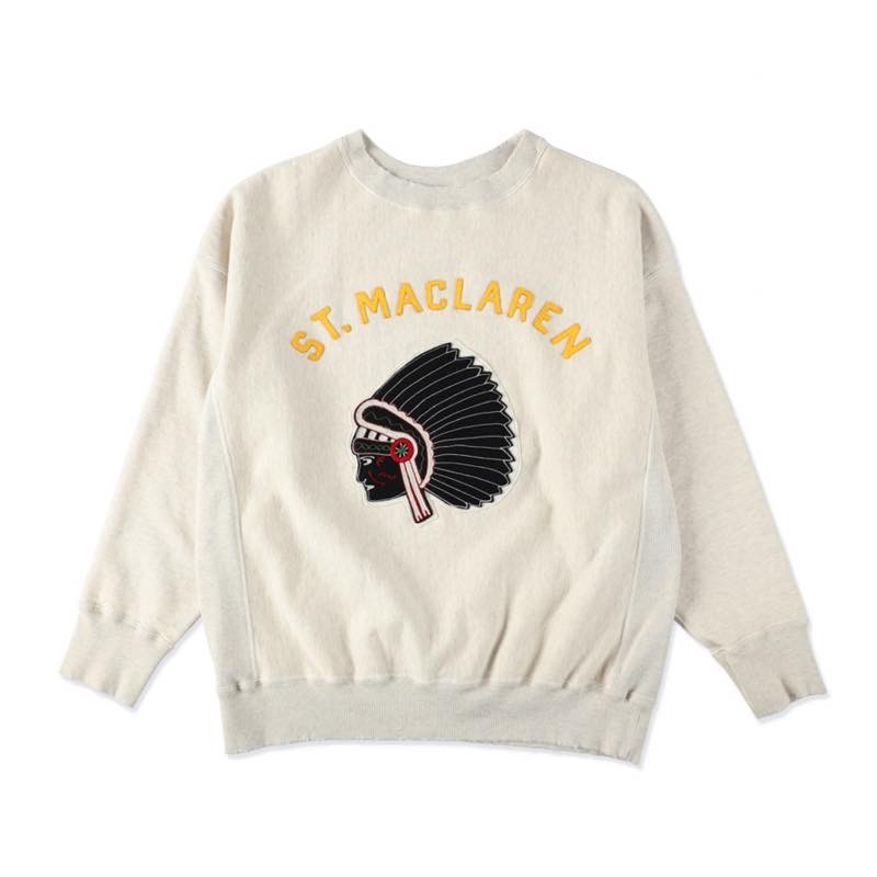 架空の大学 ST.MACLAREN UNIV. のチームスピリットを象徴する、インディアンヘッドのワッペンを前身に配したクルーネックスウェット。1940~50年代のカレッジウェアをベースに、当時の学生が誇りを胸に過ごしたキャンパスライフをイメージして製作。かなり肉厚でドライな質感のスウェット生地をオリジナルで編み立て、着込みによって生まれたフェード感や細かな毛羽立ちを再現。スタジャンとのセットアップはもちろん、単体でも存在感を放つ一枚。ヴィンテージカレッジカルチャーの空気を現代のスタイルに落とし込んだBOW WOWらしい提案。